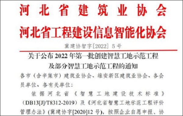 5月29日,河北省建筑业协会与河北省工程建设信息智能化协会联合发布了2022年河北省第一批创建智慧工地示范工程名单,由二分公司承建的井陉县医院救治能力提升项目获得了河北省智慧工地最高级别——三星级示范工地的荣誉。